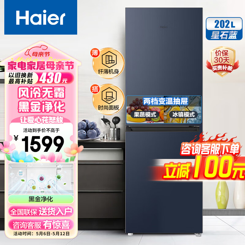 海尔(Haier)202升家用双门冰箱风冷无霜纤薄小型家用电冰箱节能省电小冰箱家用租房冰箱两门租房宿舍公寓价格:1599.00元!