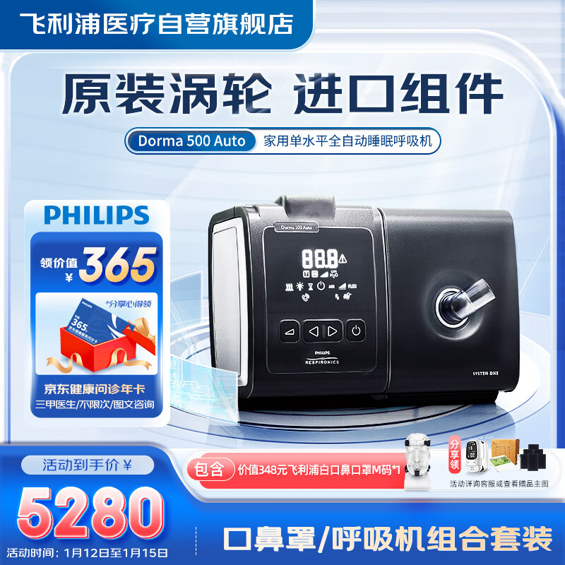 飞利浦(PHILIPS)呼吸机全自动家用无创止鼾器经典款Dorma500+白口鼻面罩M号价格:7348.00元!