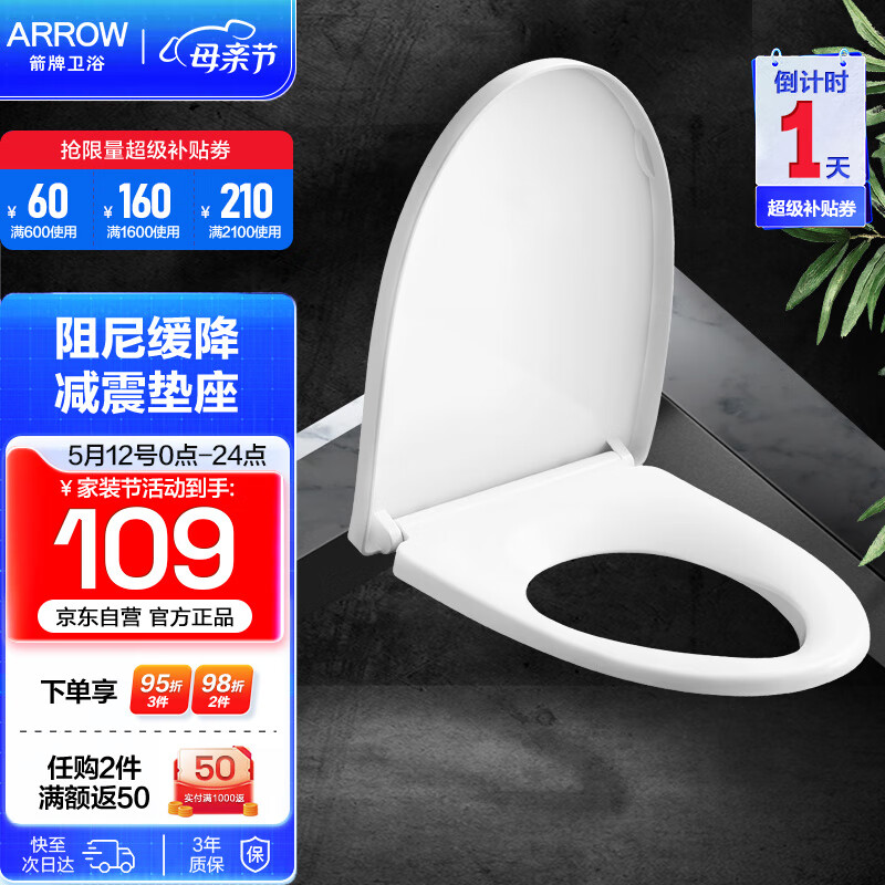 箭牌马桶盖家用通用马桶普通盖板卫生间坐便器缓降缓冲加厚双层盖板 V型价格:109.00元!