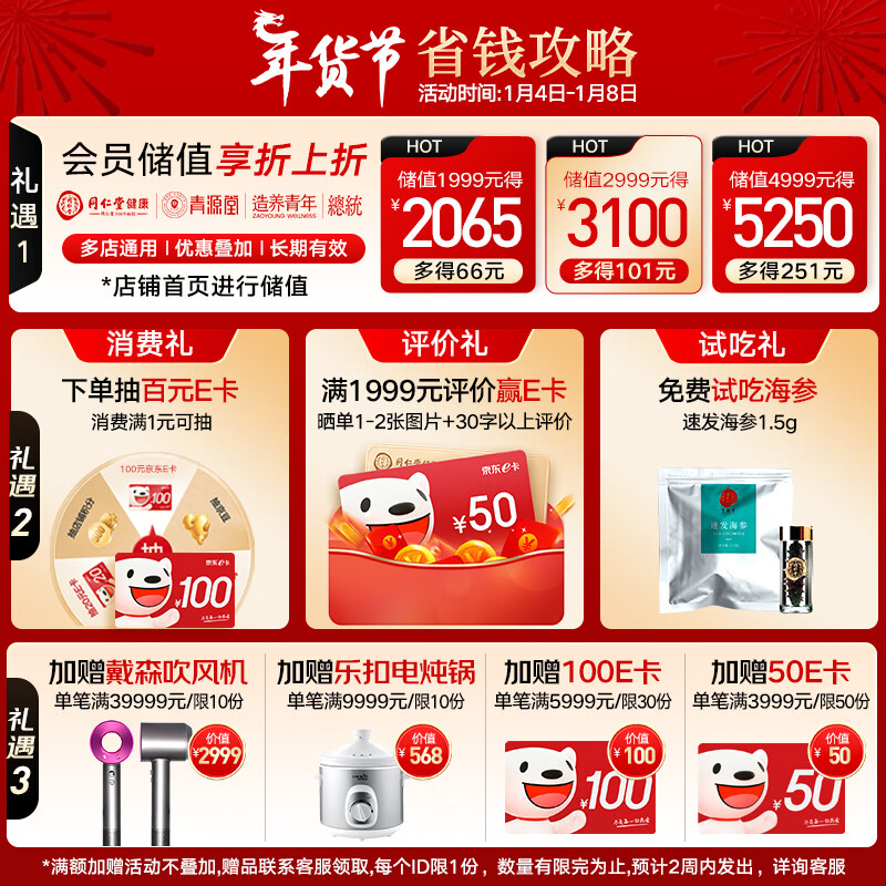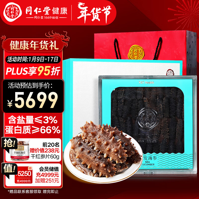 同仁堂(TRT)北京同仁堂大连淡干海参辽参净制128g42-51只简参干货过年礼盒价格:5699.00元!