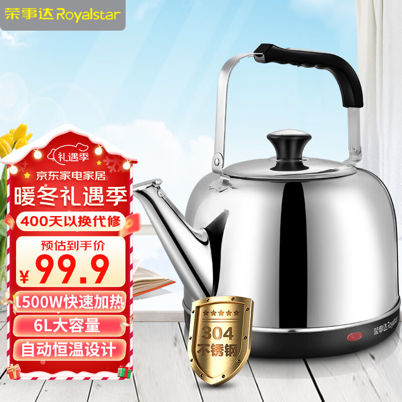 荣事达电热水壶商用家用大水壶电水壶烧水壶养生304不锈钢6L大容量保温壶JY60C价格:99.90元!