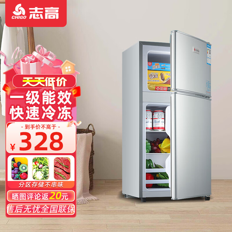 志高(CHIGO)两门迷你小冰箱租房宿舍办公室家用双温可冷冻冷藏节能环保省电低耗低音电冰箱BCD-68A128D银价格:348.00元!