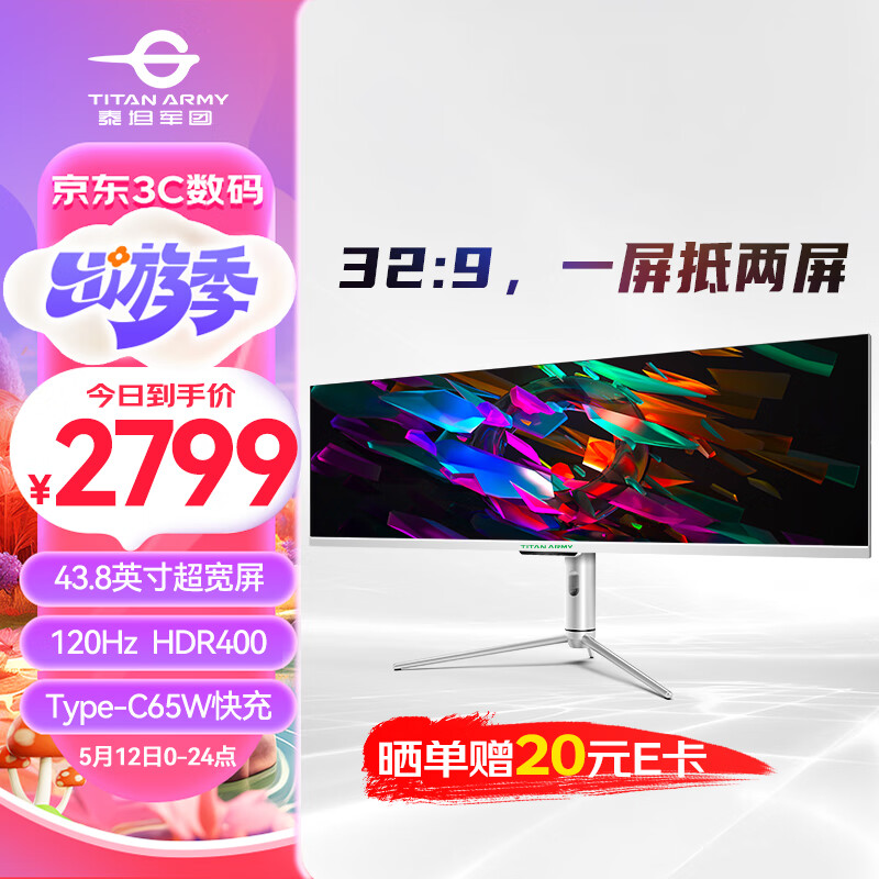 泰坦军团43.8英寸 32:9 IPS超宽屏 120Hz HDR400广色域 Type-C 65W快充 剪辑设计股票分屏电脑显示器P43UGD价格:2999.00元!