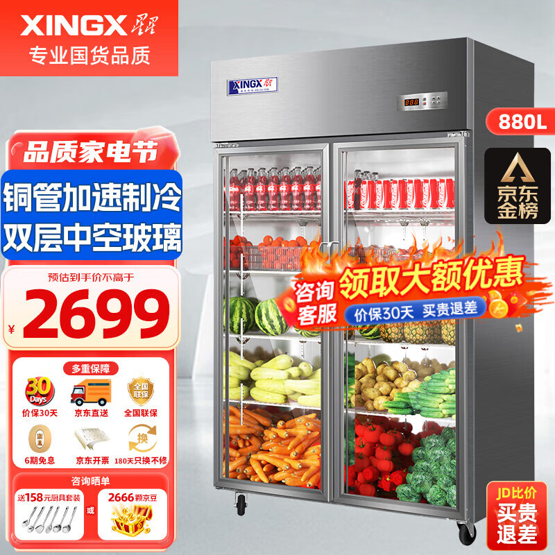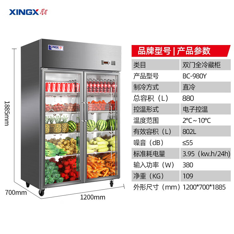 星星(XINGX)展示柜冷藏保鲜柜双开门立式冰柜 冰箱商用大容量饭店食堂厨房点菜蔬菜水果 双门铜管冷藏保鲜柜880升 BC-980Y价格:2699.00元!