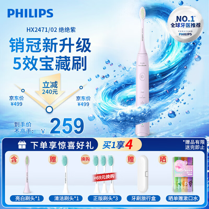 飞利浦电动牙刷S3成人情侣款送女友/男友生日礼物 5种模式 全新软毛柔和亮白刷头 5效宝藏刷 母亲节礼物 绝绝紫 HX2471/02价格:499.00元!