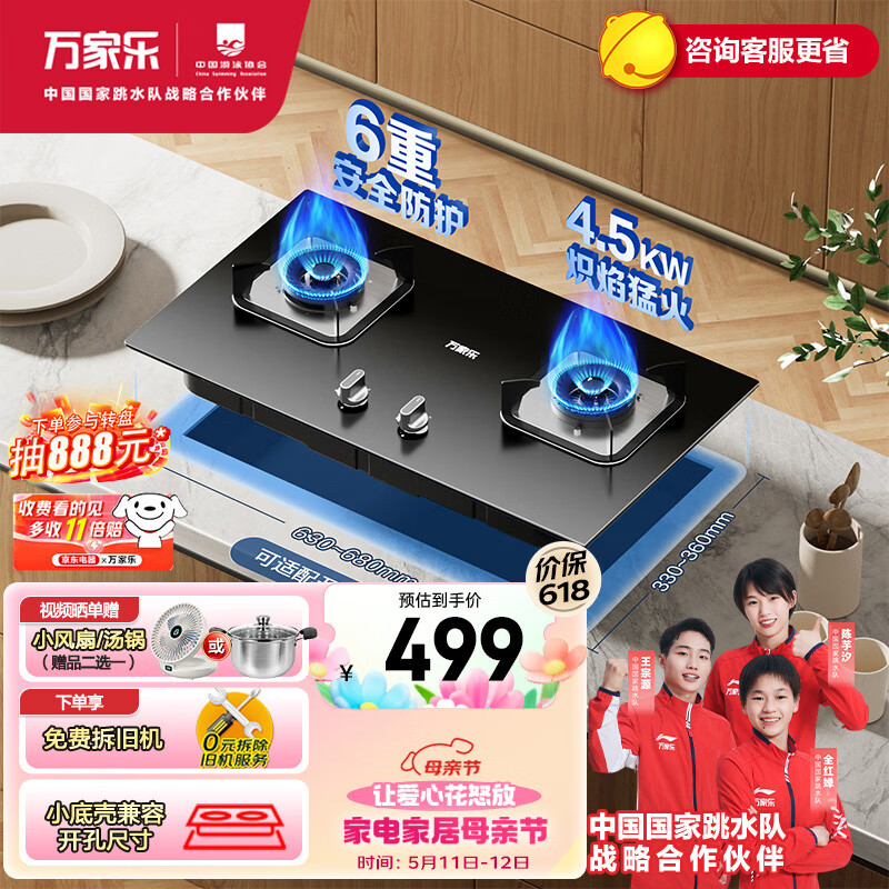 万家乐燃气灶 4.5kw大火力 台式嵌入式两用煤气灶双灶 可适配开孔尺寸 钢化玻璃全进风液化气灶JZY-AY4C价格:599.00元!