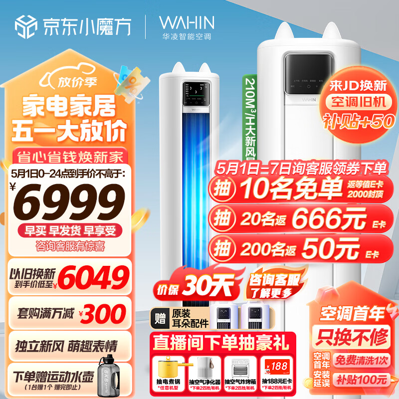 华凌 新风空调 3匹新一级 手机智能遥控 变频冷暖 210?/h大新风量 空调立式 KFR-72LW/N8HK1 以旧换新价格:6999.00元!