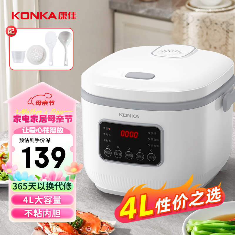 康佳(KONKA)电饭煲 家用智能预约 4L大容量3-8人煮饭煮粥锅辅食锅蒸煮米电饭锅 KDFB-4026-W价格:139.00元!