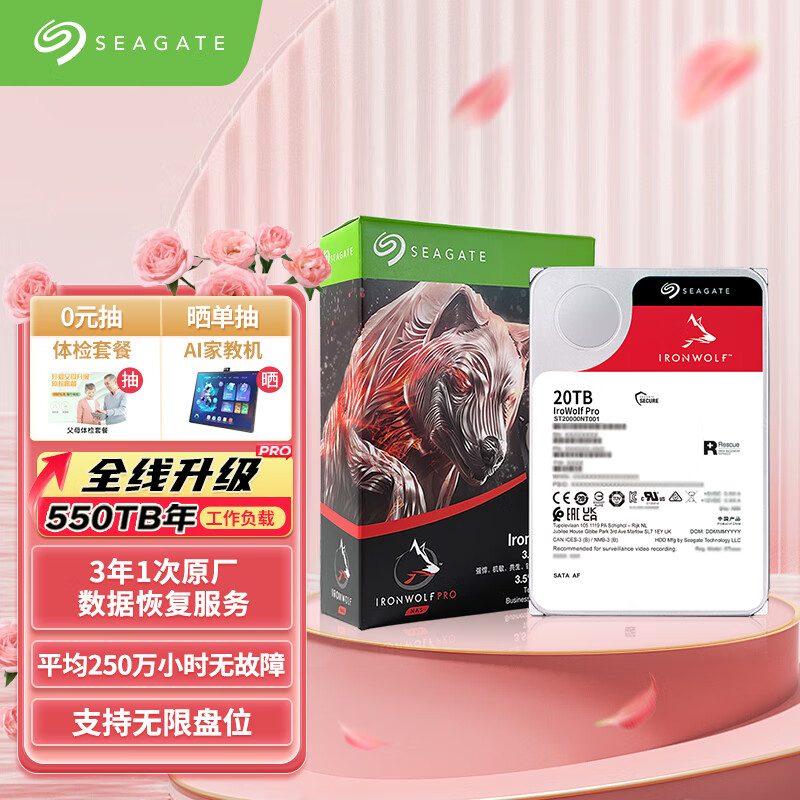 希捷(SEAGATE)NAS硬盘20TB 企业级 256MB 7200转 CMR垂直 SATA 希捷酷狼PRO 机械硬盘 550年负载 数据恢复服务价格:4599.00元!