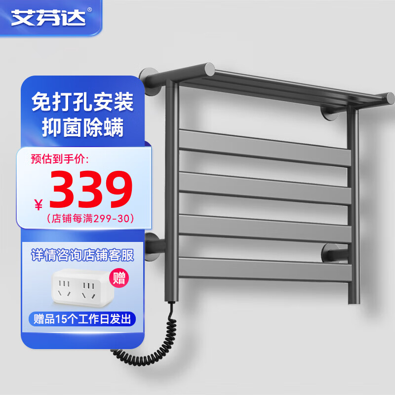 艾芬达(AVONFLOW)电热毛巾架免打孔浴室毛巾衣物烘干智能置物架 GD20碳纤维枪灰-左出线价格:389.00元!