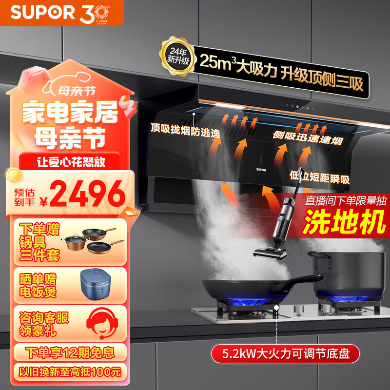 苏泊尔(SUPOR)抽油烟机 双腔拢烟顶侧双吸油烟机灶具套装 25立方大吸力变频烟灶 家用油烟机燃气灶 DL35+DS37天价格:2496.00元!