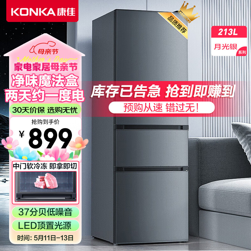 康佳213升三门小型家用电冰箱三开门三温区中门软冷冻 节能省电低噪超薄 两天仅约一度电BCD-213GQ3S价格:899.00元!