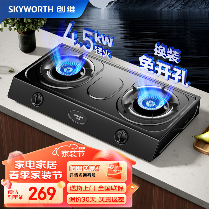 创维(Skyworth)燃气灶双灶具 4.5KW大火力家用猛火台式灶 液化气双灶炉具煤气灶台Z201T(液化气)价格:269.00元!