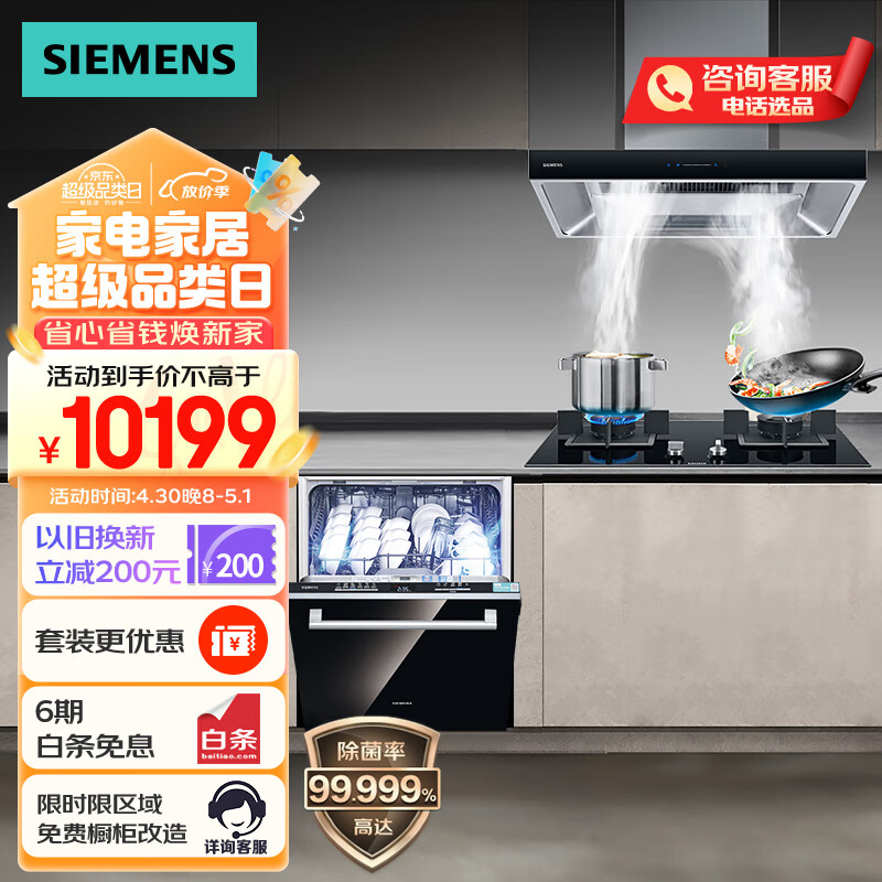 西门子14套嵌入式洗碗机智能开门烘干 5D环吸抽油烟机灶具套装(天然气)636Pro(含黑门板)+951W+F23MP价格:10199.00元!