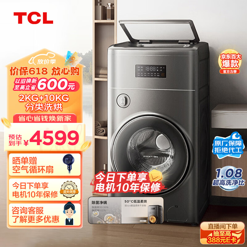 TCL 12KG双子舱·复式分区洗烘一体机T300 除菌除螨 直驱变频滚筒洗衣机 APP智控 G120T300-HDY价格:4599.00元!