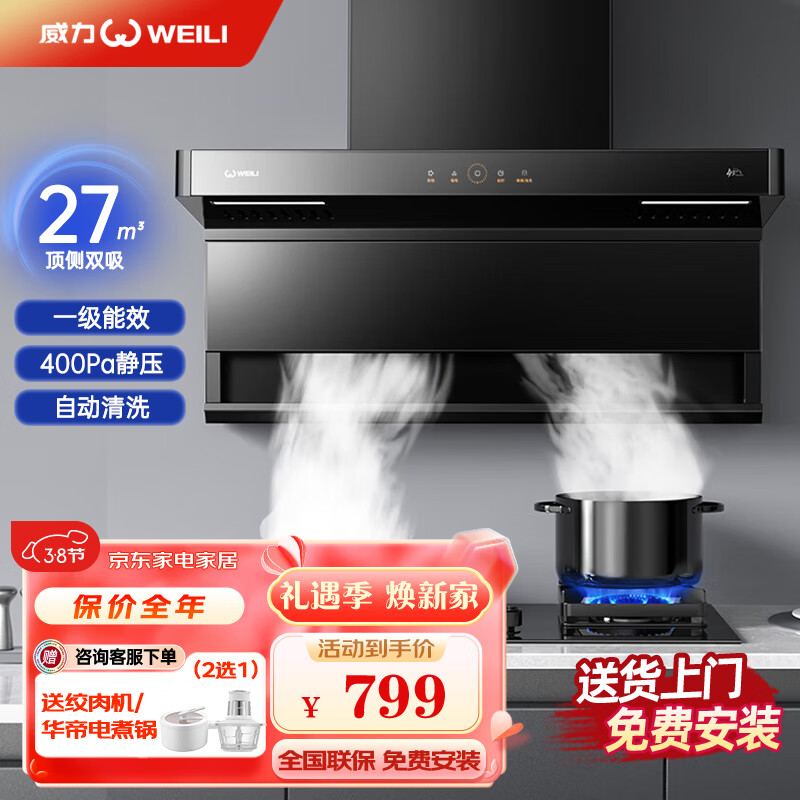 威力(WEILI)顶侧双吸油烟机 7字型抽油烟机家用 27m3/min爆炒大吸力厨房自动清洗 一级能效 WLQ05价格:799.00元!
