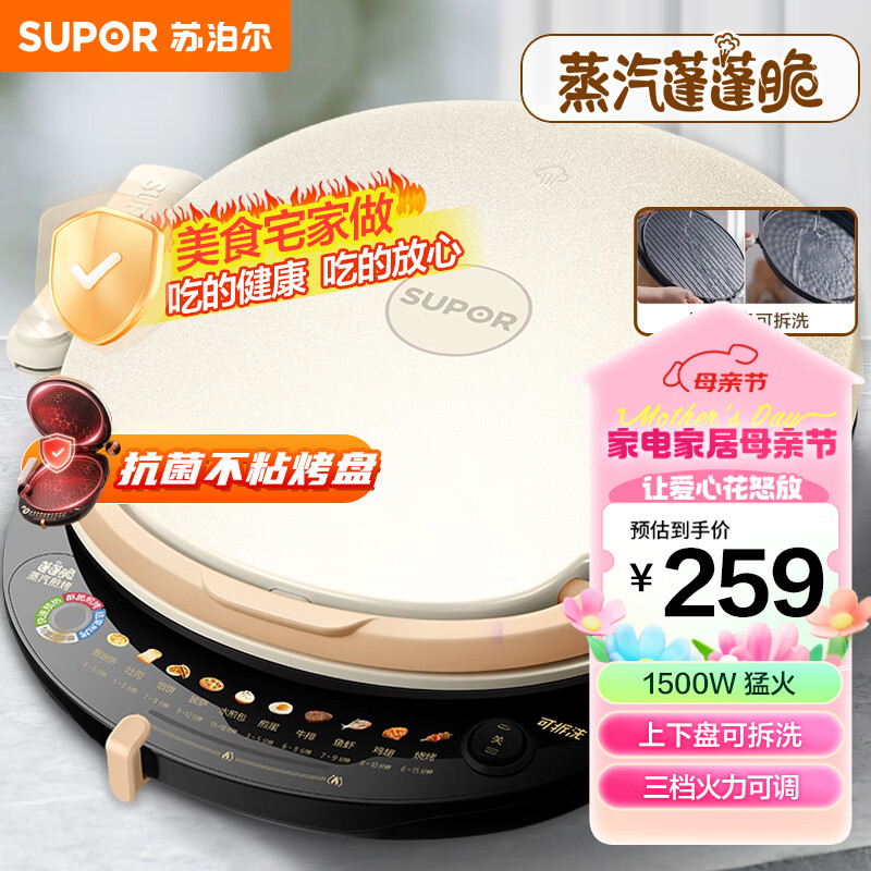 苏泊尔(SUPOR)电饼铛 电饼档 家用双面加热大火力 上下可拆洗 煎饼锅 烙饼锅早餐机多功能蒸汽煎烤机 JD30RQ828价格:255.00元!