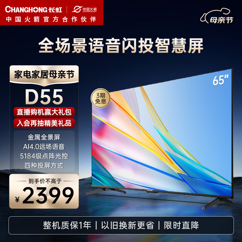 长虹电视65D55 65英寸4K超高清 免遥控语音 全景屏 2+16GB 四大投屏 平板液晶LED电视机 以旧换新价格:2399.00元!