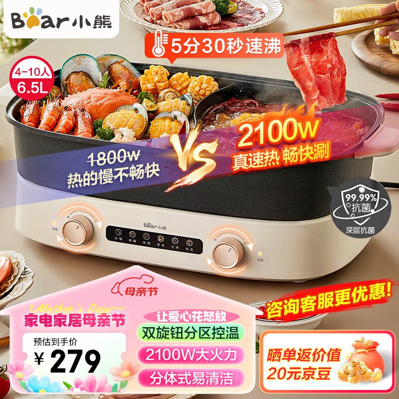 小熊(Bear)火锅专用锅 鸳鸯锅 电火锅 多功能锅 6.5L大容量 双旋钮独立控温 分体式家用电煮锅电热锅多用途锅 【2100W大火力|6分钟速沸】 6.5L价格:279.00元!