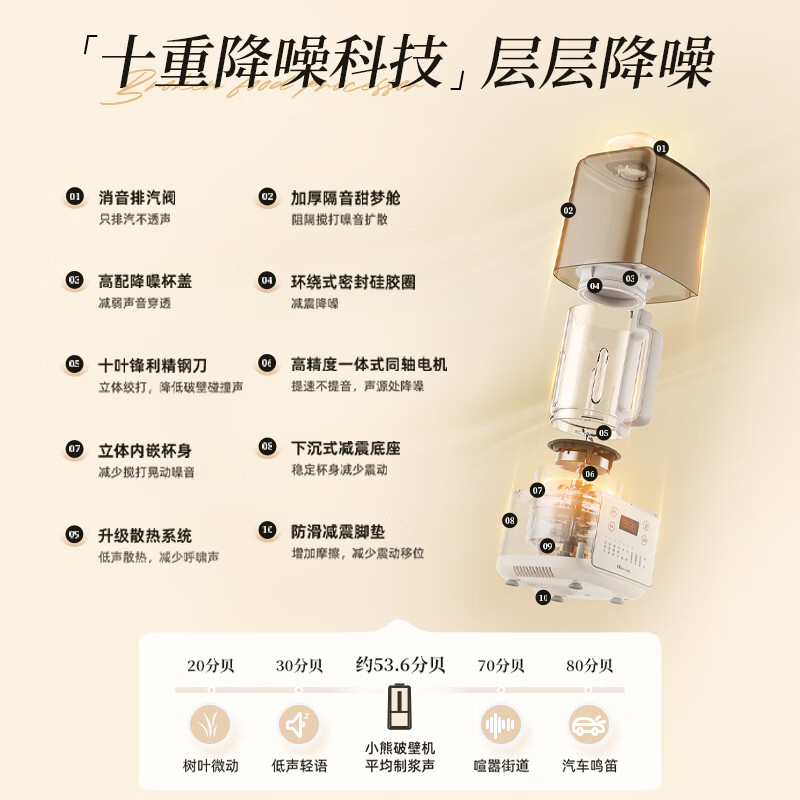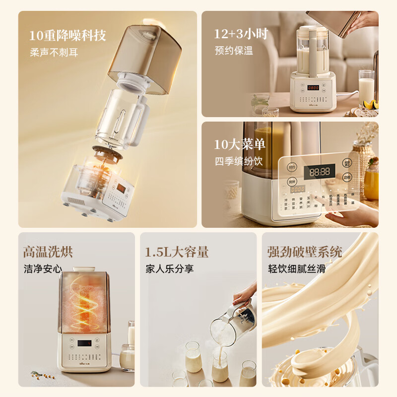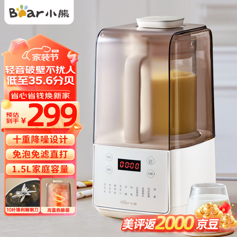 小熊(Bear)低音降噪破壁机 1.5L家用豆浆机 预约多功能全自动米糊机 五谷杂粮料理机榨汁机PBJ-F01G1价格:299.00元!
