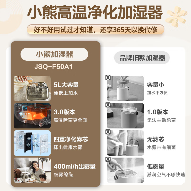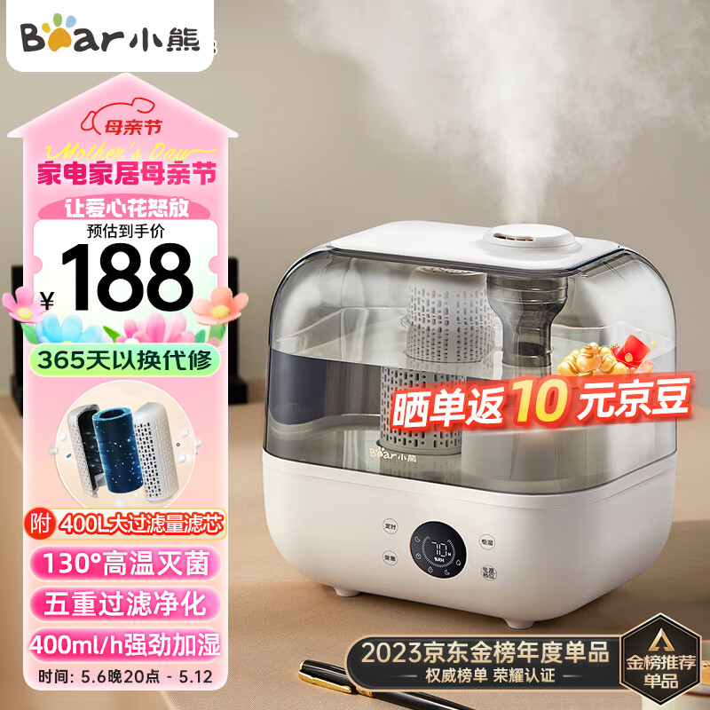 小熊(Bear)加湿器 卧室婴儿用办公桌面大容量 家用低噪可定时智能恒湿母婴高温除菌空气加湿净化JSQ-F50A1 5L价格:268.00元!