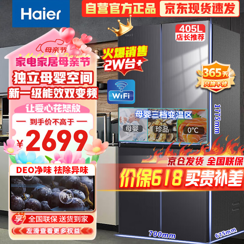 海尔(Haier)405升十字对开门冰箱四开门多门一级能效风冷无霜电母婴超薄智能双变频BCD-405WLHTDEDS9U1价格:2699.00元!