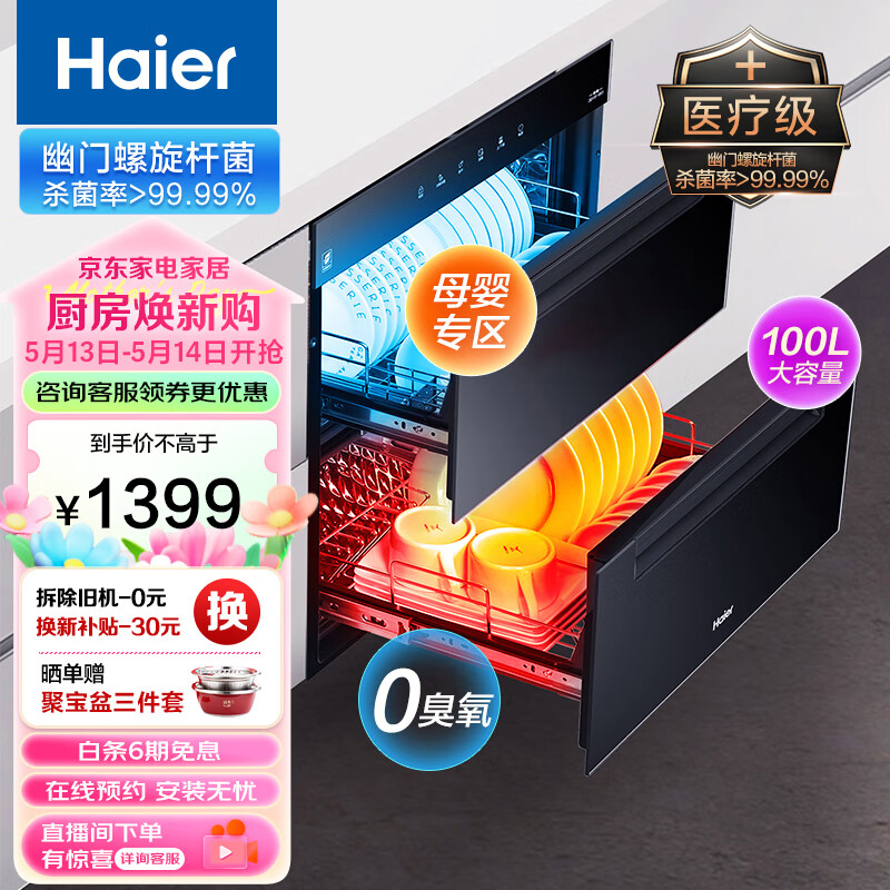 海尔(Haier)消毒柜嵌入式 家用消毒碗柜 100L双二星上下独立控制 紫外线+光波巴氏升级消毒0臭氧 婴儿奶瓶EB03价格:1399.00元!