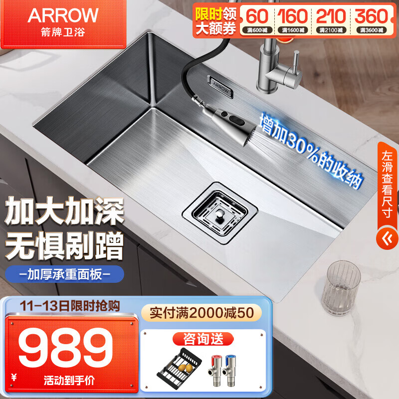 箭牌(ARROW) 304不锈钢厨房手工水槽大单槽洗菜盆洗碗池盆茶水间台上台下盆 70*43窄边手工槽+冷热抽拉龙头价格:1139.00元!