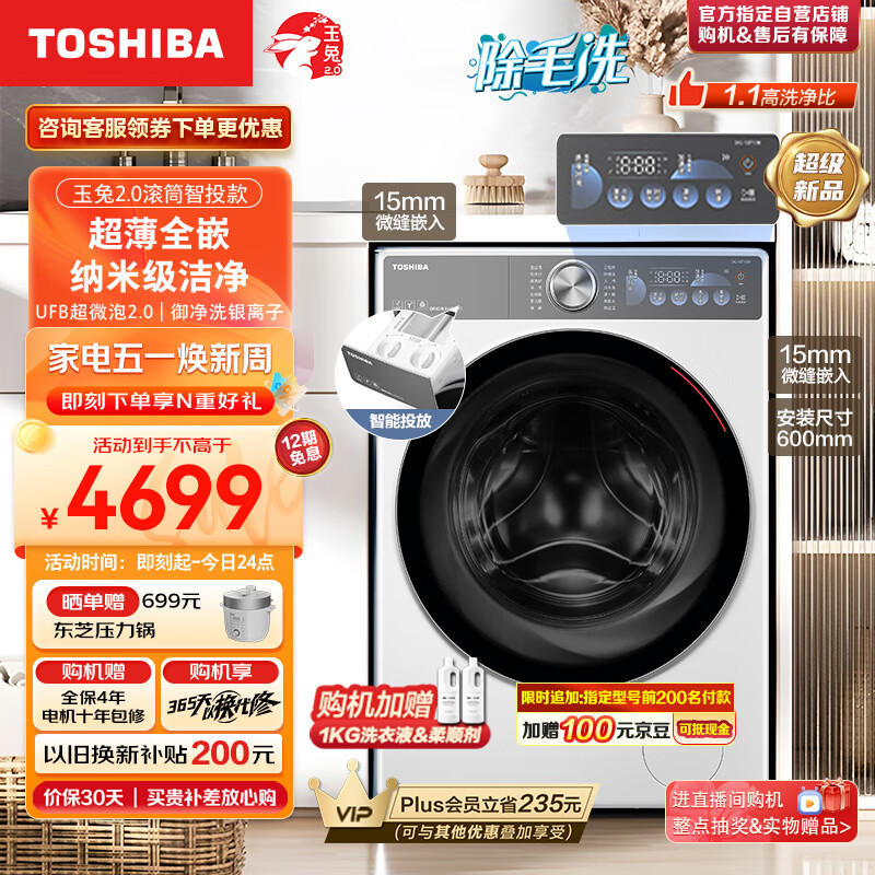 东芝(TOSHIBA)滚筒洗衣机全自动【玉兔2.0 DG-10T19BI】超薄全嵌 10公斤大容量 智能投放 银离子除菌价格:4699.00元!