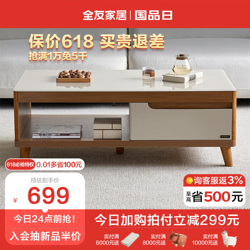 全友家居 茶几木纹茶几简约小户型客厅储物柜北欧茶几120722B价格:998.57元!