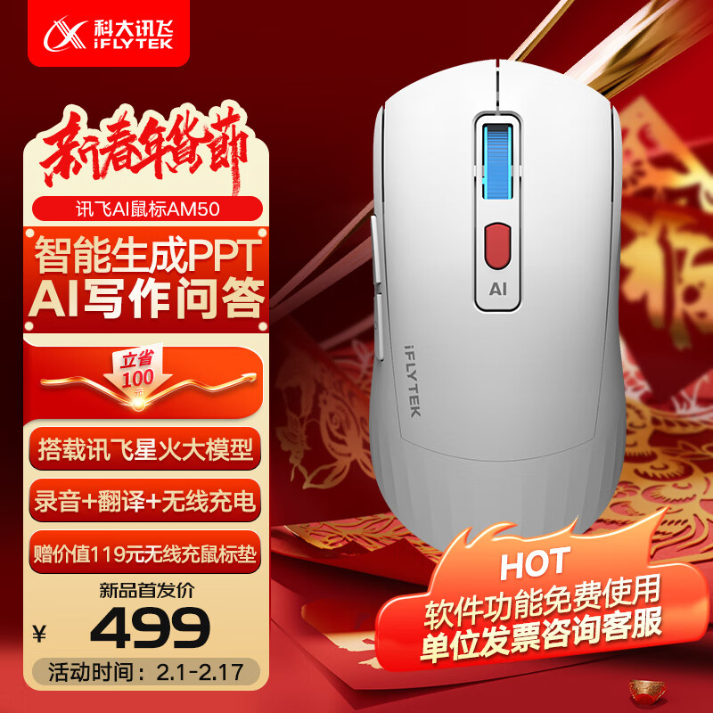 科大讯飞 AI智能鼠标AM50 无线鼠标 蓝牙鼠标 AI写作问答 智能生成PPT 无线充电 办公鼠标 白色价格:499.00元!