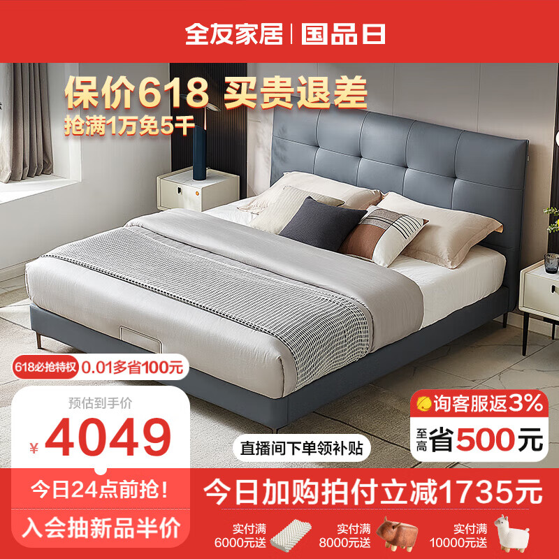 全友家居 皮艺床现代简约头层牛皮主卧室双人软包真皮床1.8x2米105308价格:5784.29元!