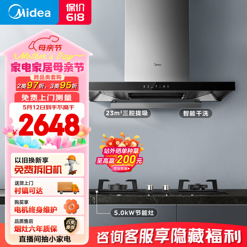 美的(Midea)顶吸欧式抽油烟机 23大吸力 家用厨房油烟机 三腔自动清洗 烟灶套装 TQ307+Q325(天然气)价格:2648.00元!