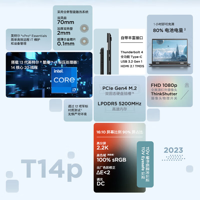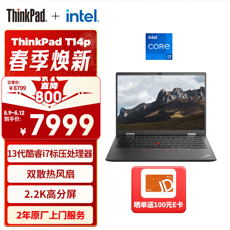 ThinkPad T14p 联想14英寸高性能标压工程师本笔记本电脑 13代酷睿i7-13700H 16G 512G 2.2K 商务办公本价格:7999.00元!