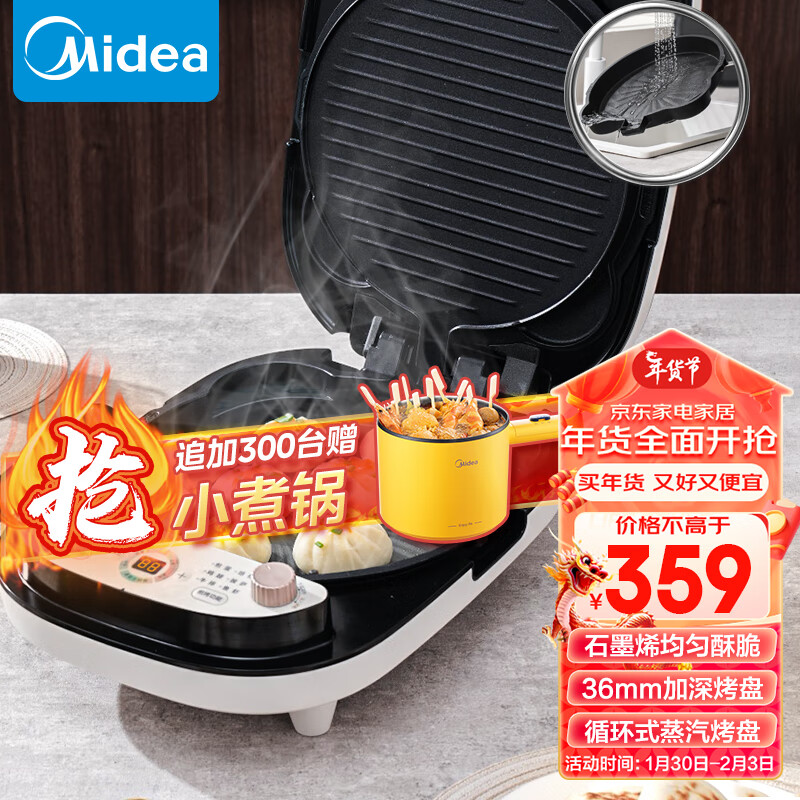 美的(Midea)电饼铛智能家庭用加深上下盘可拆洗双面加热大火力煎饼烙饼锅三明治机早餐机蒸汽嫩烤煎烤JKS3088价格:359.00元!