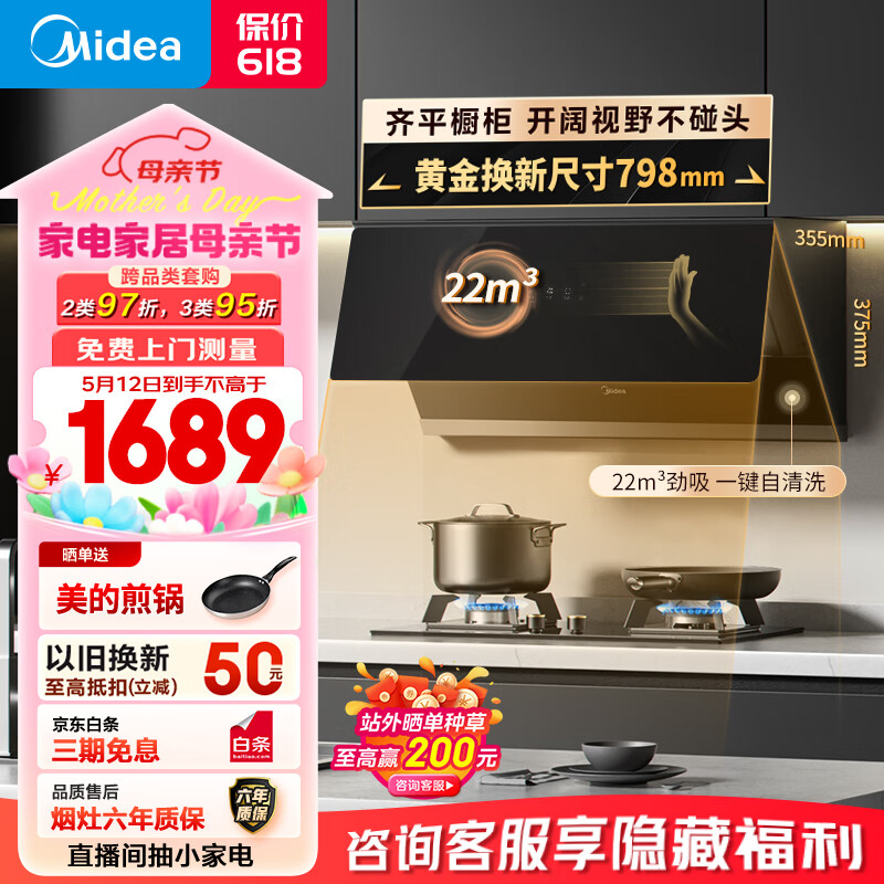 美的(Midea)抽油烟机灶具套装 家用厨房侧吸式22大风量挥手自动清洁超薄近吸烟机 小尺寸油烟机CXW-280-J37价格:1689.00元!