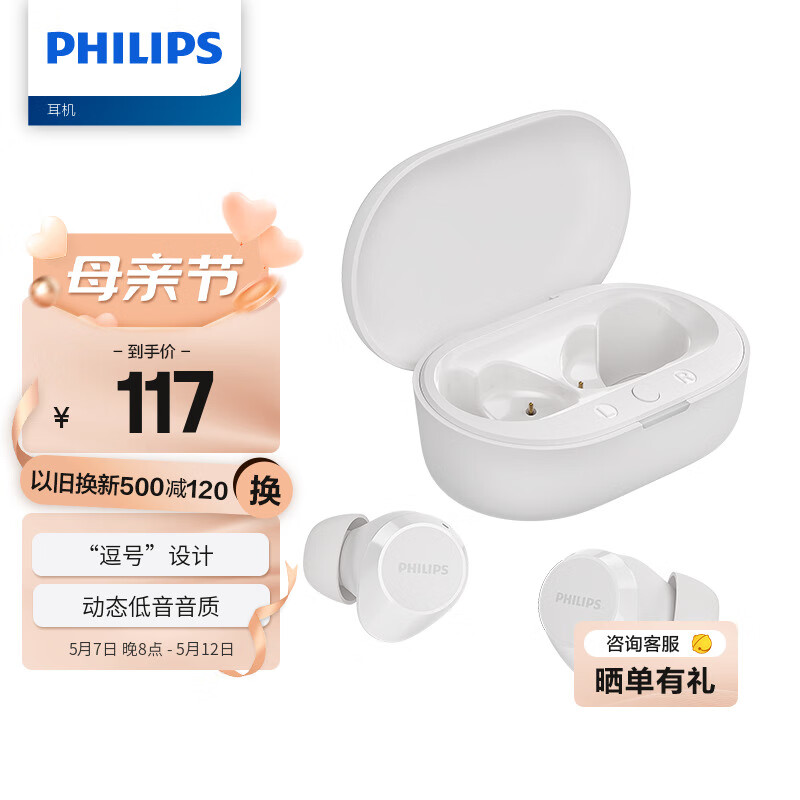 飞利浦(PHILIPS)豆式入耳耳机真无线蓝牙耳机运动耳机游戏耳机回音降噪智能配对苹果华为手机TAT1209白色价格:117.00元!