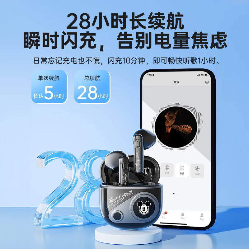 迪士尼(DISNEY)蓝牙耳机无线半入耳式 跑步运动音乐降噪电竞游戏低延迟Type-C 适用小米华为苹果QST8【黑色米奇】价格:159.00元!
