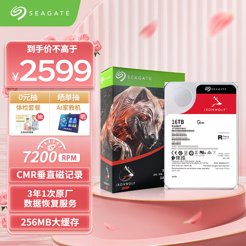 希捷(SEAGATE)NAS硬盘 16TB 256MB 7200转 CMR垂直 网络存储 SATA 希捷酷狼 机械硬盘 数据恢复服务 3.5英寸价格:2309.00元!