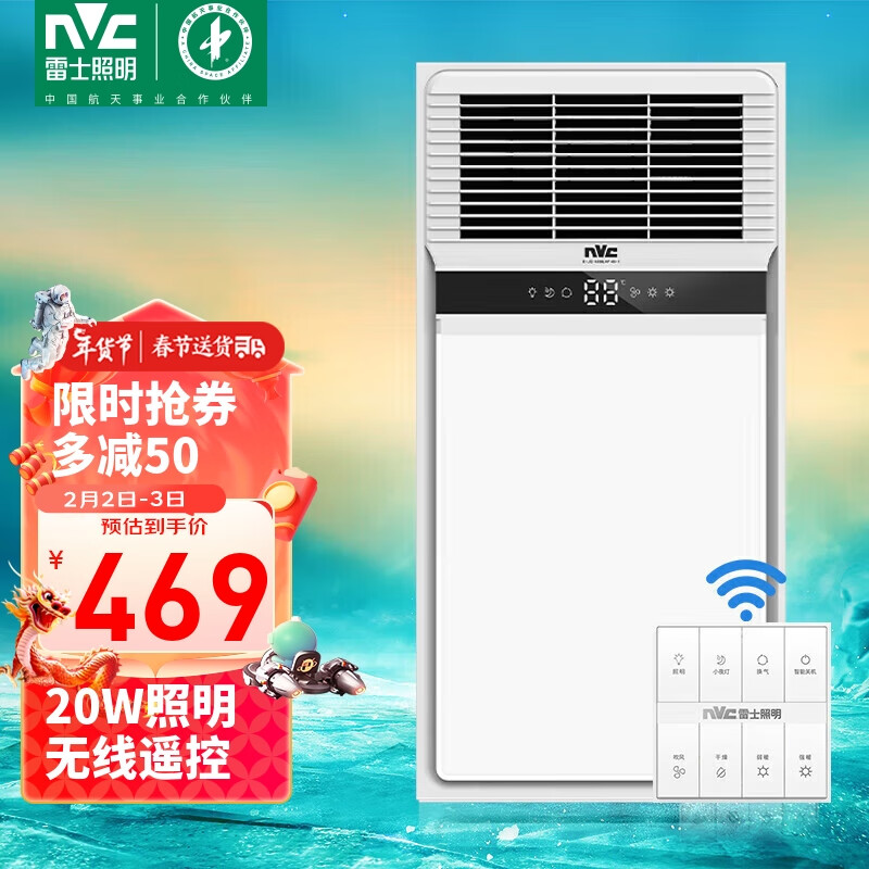 雷士(NVC)八合一智能风暖浴霸排气扇照明一体 卫生间 暖风机浴室价格:649.00元!