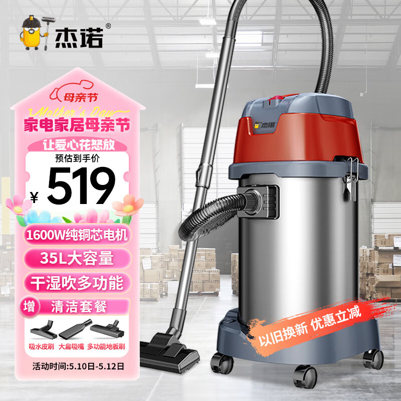 杰诺1600W大功率干湿吹三用桶式吸尘器家用商用车用办公室地毯洗车店JN603S价格:569.00元!
