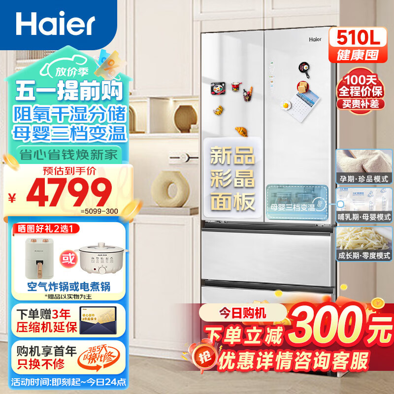 海尔(Haier)510升大容量法式多门四开门家用电冰箱 全新彩晶面板 超薄嵌入式 变频无霜三档变温净味价格:4999.00元!