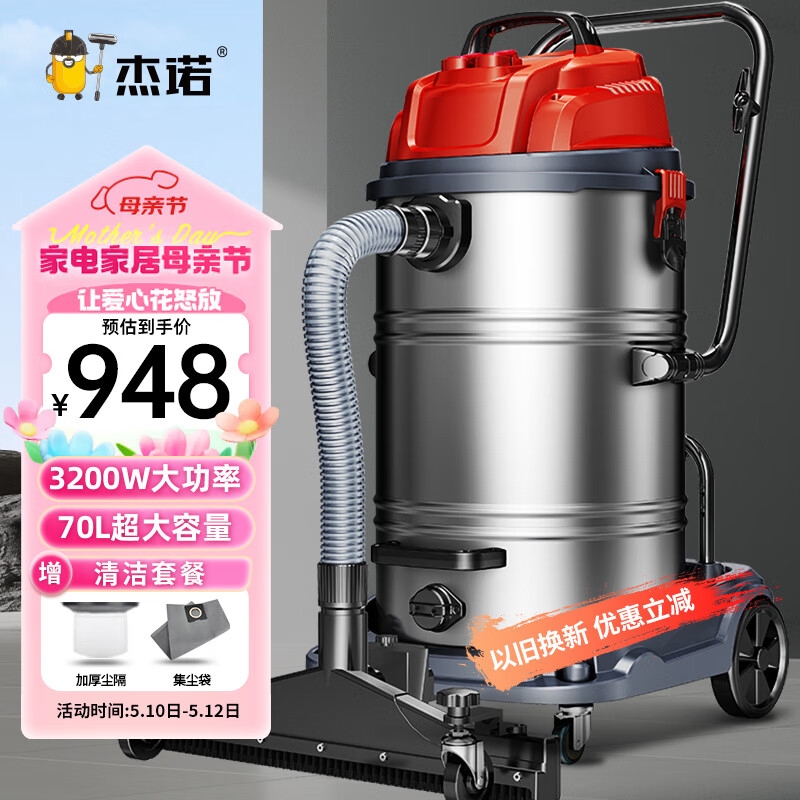 杰诺3200w大功率商用工业吸尘器吸水车间工厂粉尘强力干湿两用70L大容量JN309地刷豪华款价格:1148.00元!