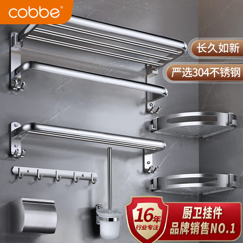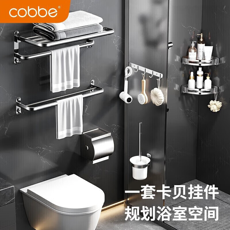 卡贝(cobbe)304不锈钢毛巾架卫生间置物架浴室免打孔浴巾架卫浴五金挂件套装价格:308.00元!