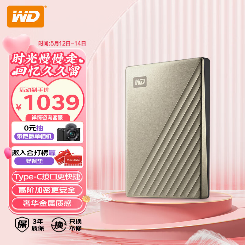 西部数据(WD)5TB 移动硬盘 type-c My Passport Ultra 2.5英寸 金 机械硬盘 大容量 手机电脑外接 加密兼容Mac价格:1059.00元!