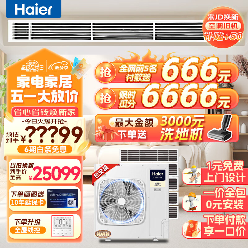 海尔(Haier)中央空调一拖五风管机6匹小多联一级能效全直流变频嵌入式智尊+ RFC140MXSAVB(F)价格:27999.00元!