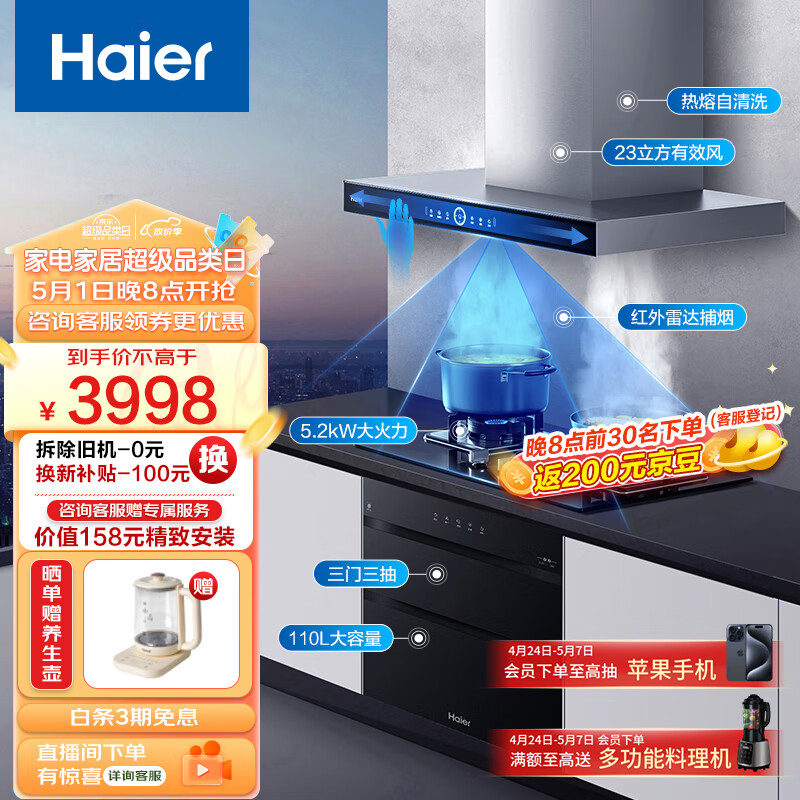 海尔(Haier)抽油烟机 顶吸烟灶消三件套 23m3/min有效风 5.2kw大火力 110L三抽消毒柜ET931+Q2BE3(天)+EB031价格:3998.00元!