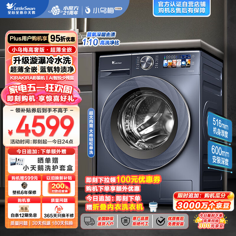 小天鹅(LittleSwan)滚筒洗衣机全自动 超薄全嵌【小乌梅高奢版TG100VIC】516mm机身 蓝氧特渍净 漩瀑水流 10公斤价格:4999.00元!