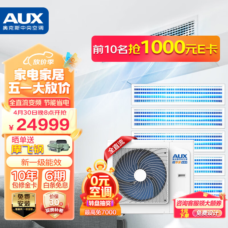 奥克斯(AUX)中央空调6匹一拖五多联机风管机一级能效全直流变频智能清洁嵌入式空调适用四室一厅DLR-H145W(G1)价格:24999.00元!
