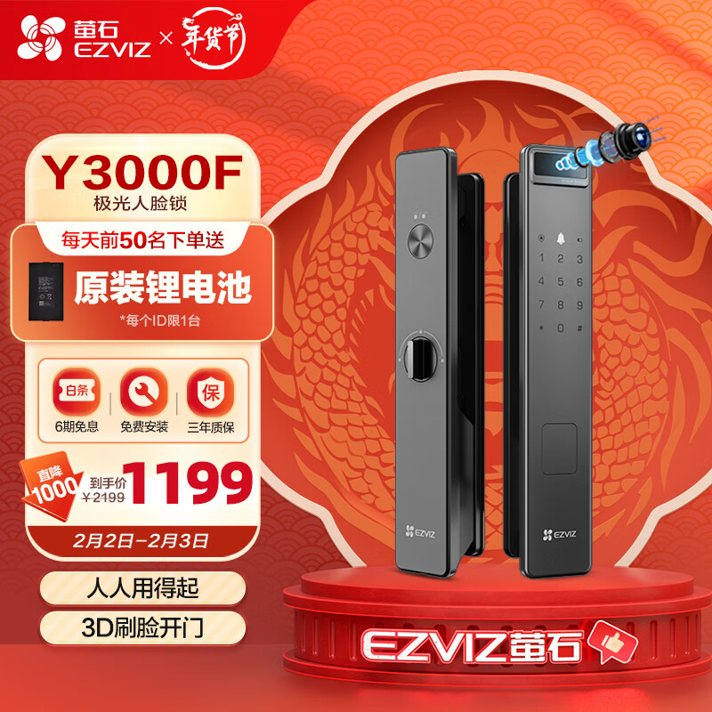 萤石Y3000F极光人脸锁 灰 3D人脸识别无需指纹 家用全自动智能电子密码锁 C级锁芯防盗电子门锁价格:1199.00元!